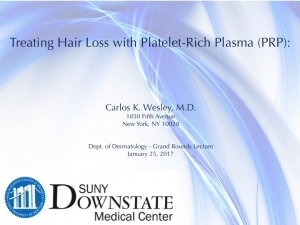 Initially used during the 1970s as a physiologic adhesive for eye surgery, platelet-rich plasma (PRP) has since found applications in orthopedics, rheumatology, odontology, and cosmetic dermatology. The autologous (meaning when the donor individual is the same as the recipient) use of PRP has more recently demonstrated considerable benefit in hair restoration. Click below to view a recent Grand Rounds lecture by Dr. Wesley to the Department of Dermatology at The State University of New York Health Science Center.